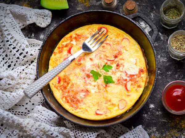 Посыпать омлет сверху измельчённым укропом и накрыть сковороду крышкой. Готовить омлет 4-5 минут на небольшом огне, затем выключив огонь оставить его под крышкой ещё на 5-10 минут.