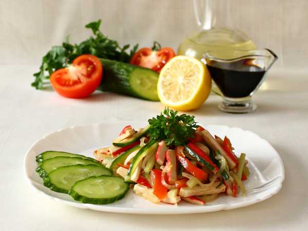 Заправьте салат соевым соусом с классическим вкусом или же с добавками (чеснок, имбирь, грибы). Солить салат дополнительно не нужно, а вот специями можно присыпать.