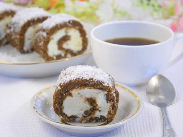 Быстро свернуть рулет с помощью пергамента, края закрепить, как у конфеты, и положить в холодильник на 2 часа.