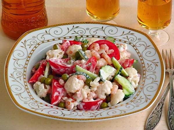 Креветки чистим от панцирей, если они были в панцирях. На момент начала приготовления салата креветки должны быть полностью оттаявшими.