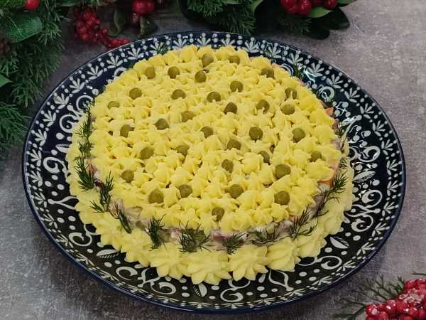 Верх смазать майонезом и оставить салат в форме на несколько часов в прохладном месте, а затем выложить на блюдо.