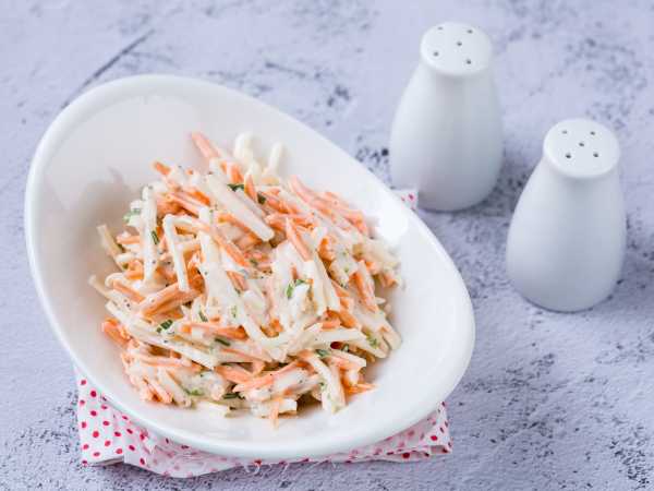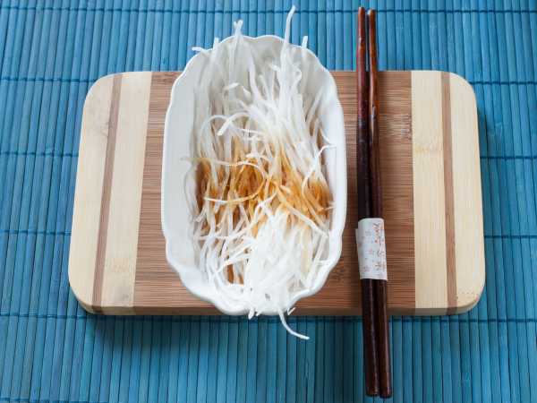 Таким же образом измельчите корнеплод моркови. Добавьте его в салатник с дайконом.