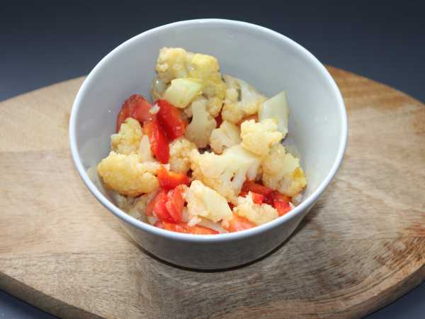 Добавить перцы и лавр, довести до кипения и варить под крышкой на слабом огне до мягкости цветной капусты.