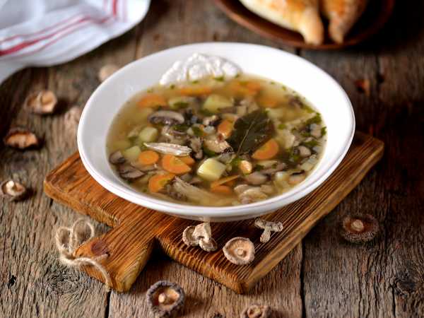 В готовые овощи выложить грибы и мелко рубленный укроп, снова довести до кипения и снять с плиты. Постный грибной суп без растительного масла готов к подаче на стол.