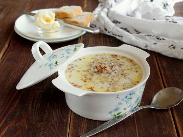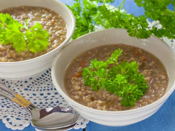 Также добавим промытую под проточной водой гречневую крупу. Ставим кастрюлю на огонь и готовим суп 20 минут, до мягкости картофеля.