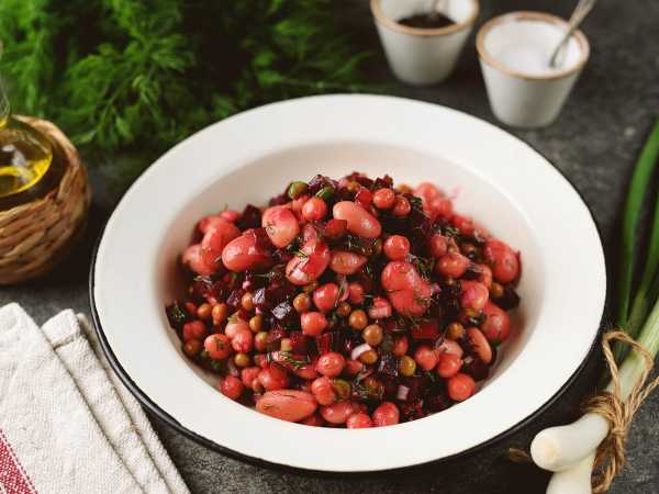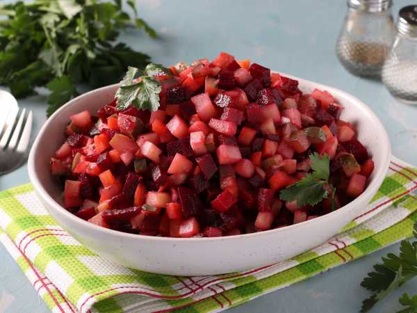 Классический винегрет с горошком готов. По желанию, присыпьте салат мелко нарезанным зеленым луком и подавайте к столу.