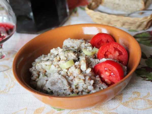 Теперь выложим промытую гречку, добавим воды или бульона из расчёта 2:1 к гречке по объёму. Помидор мелко порежем, добавим измельчённый чеснок, немного подсолим.