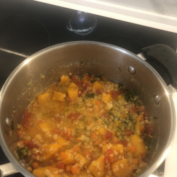 По ошибке добавила протертые томаты вместе с чечевицей, а по рецепту нужно было в конце варки добавить помидоры, но вкус был невероятный. На второй день суп стал ещё вкуснее, раскрылся вкус томата с чесноком, а вкус тыквы стал не таким ярким. Спасибо автору рецепта