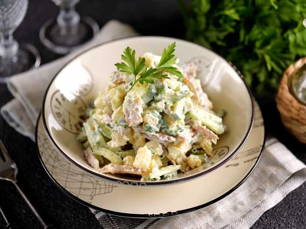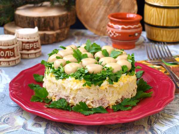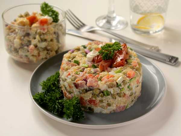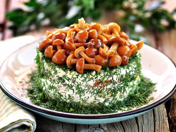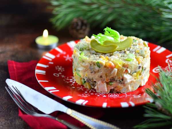 Украсить тарелку зеленью и подать классический салат «Полянка» к столу.
