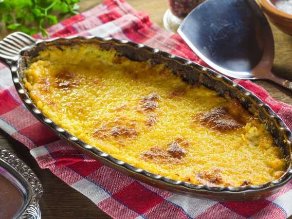Выкладываем в жаропрочную форму суфле из камбалы, слегка разравниваем поверхность.