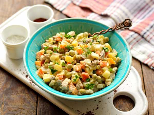 Перемешиваем, заправляем майонезом, украшаем зеленью и подаём на стол. Сочный, хрустящий, ароматный и сытный - вот такой салат с курицей и зелёным горошком у нас получился!