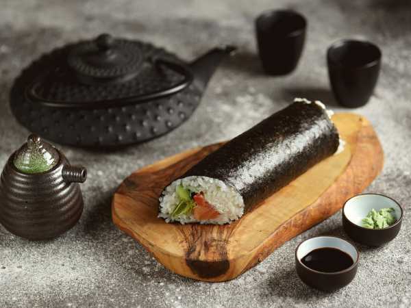 На циновку выложите лист нори глянцевой стороной вниз. На водоросли выложите слой риса, оставьте 1 см нори с противоположной стороны свободными.