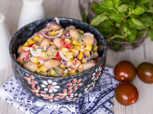 Добавить в салат отваренную фасоль. Кстати, фасоль можно взять и консервированную.