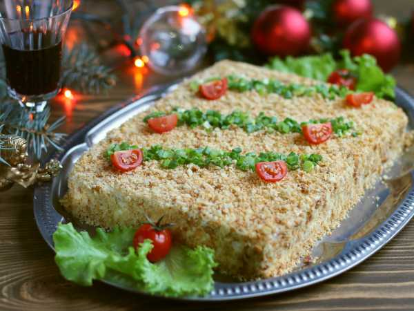 Далее повторить все слои в том же порядке из оставшихся продуктов. Сверху можно разложить листочки петрушки, посыпать зелёным луком.