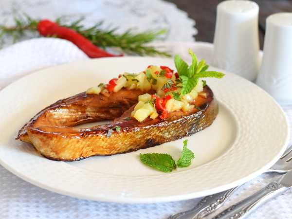 Стейк из лосося с овощами-гриль готов. Вкусный и полезный обед или ужин готов.