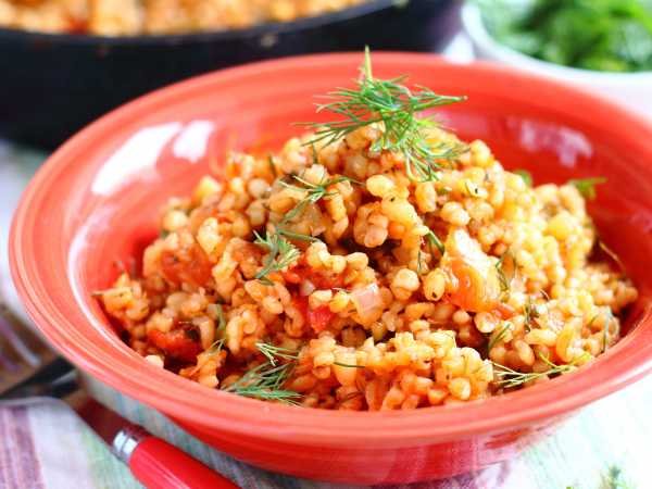 Спустя минут 5 пересыпьте в сковороду рис для ризотто. Перемешайте и обжаривайте с овощами минут 5-7.