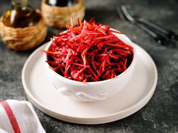 Натрите свеклу и морковь на терке или нарежьте тонкими длинными брусочками.