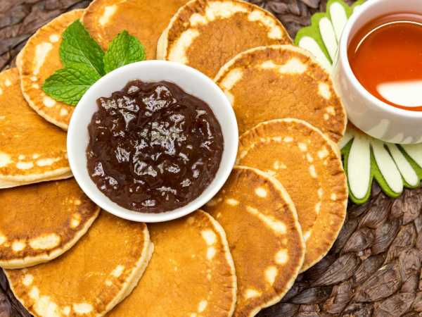 На стол тонкие блины с дырочками на воде подавайте со сметаной, вареньем, сиропами или медом.
