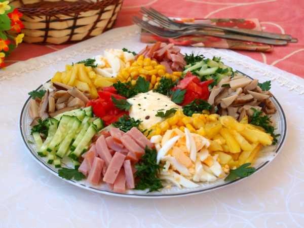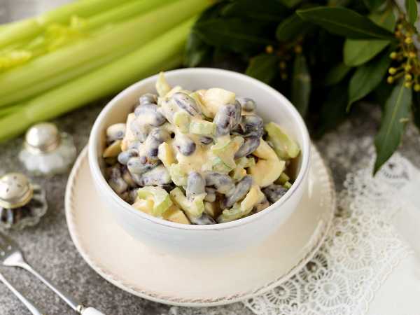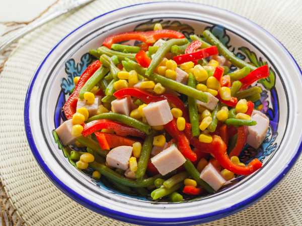 Соединяем все ингредиенты, приправляем салат с фасолью, яйцами и ветчиной сметаной, солью и перцем. Размешиваем.