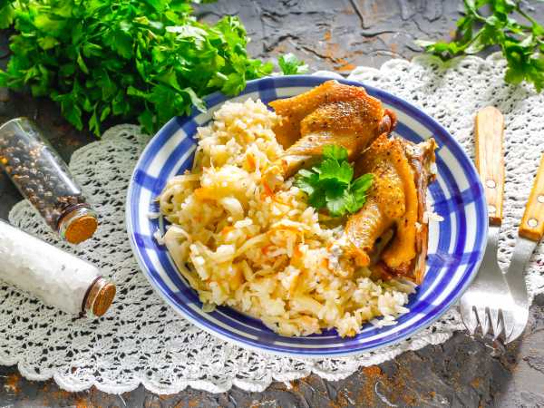 Заранее я отвариваю части индюшачьего бедра в соленой воде с добавлением сухих трав: тимьяна, майорана и базилика. Так рис будет тушиться сразу в ароматной и насыщенной яркими вкусами жидкости.