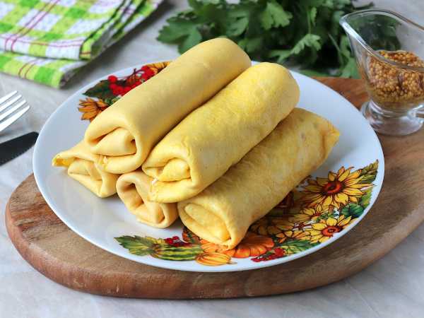На готовый блин выкладываем яблоки и скручиваем его трубочкой.