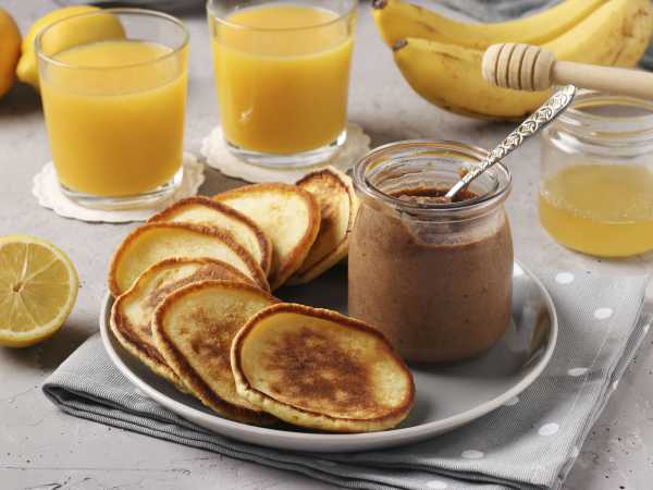 Пышные оладьи на простокваше на дрожжах готовы. Подаем их со сметаной, жидким медом, вареньем или сгущенным молоком.