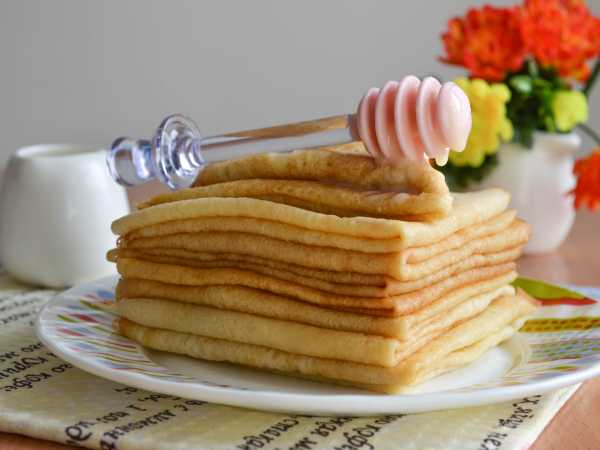Складываем блинчики стопочкой. Чтобы тонкие блинчики не успели подсохнуть, смазываем их сливочным маслом и накрываем перевернутой тарелкой.