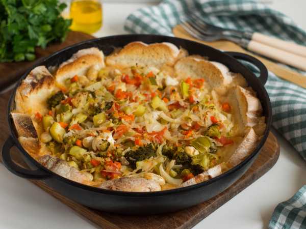 Залить овощи томатным соусом, по желанию можно добавить жгучий перец для вкуса. Проварить три минуты.