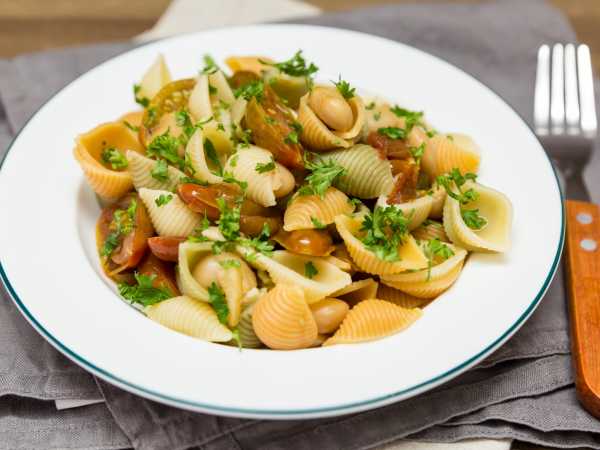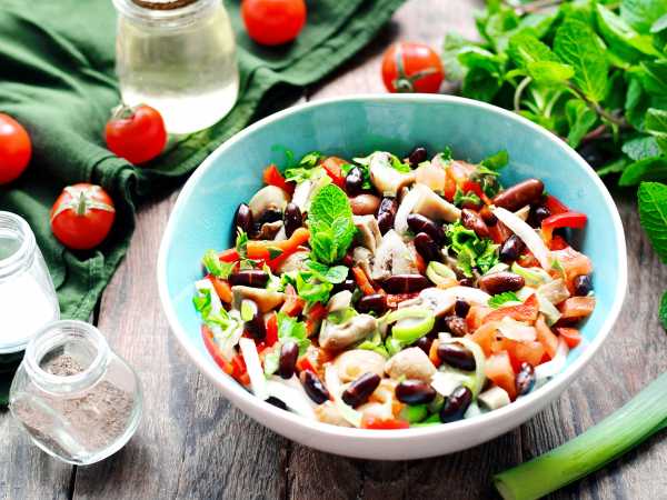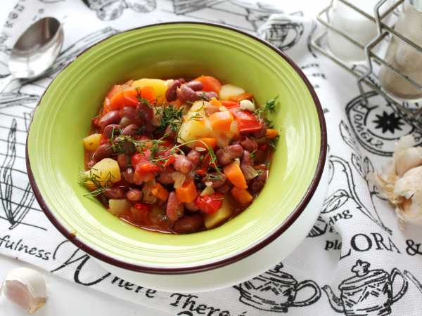 Добавить фасоль в сковороду к овощам, аккуратно перемешать. Прогреть на огне три минуты, проверив на соль.