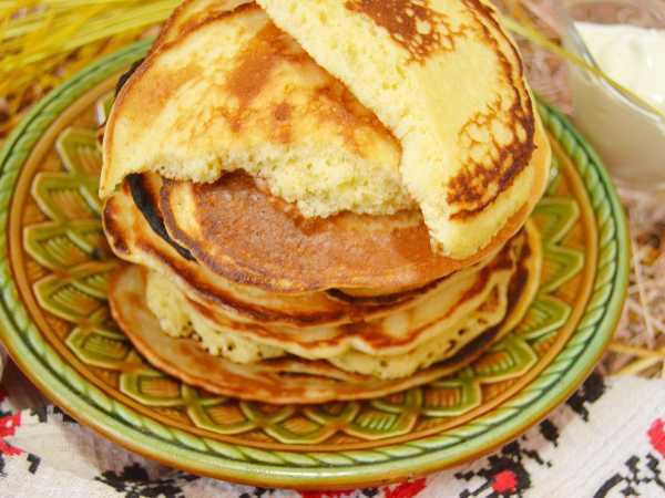 Выпекаем блины на предварительно прогретой сковороде в растительном масле. Керамическая электроплита - режим 8. Перед каждым блином подливаем на сковороду свежее масло так, чтобы сковорода была всегда им покрыта. Один блин - одна поварешка "с горкой". Поварешку, кстати, держим не в тесте, а рядом - если ее положить в тесто, оно будет терять воздушность. Это то же самое, что его перемешать.