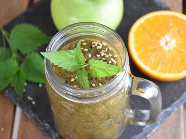 Добавьте по вкусу немного меда (сахара или другого подсластителя по вкусу), а также молотую корицу и имбирь. Взбейте все еще несколько секунд и при необходимости добавьте еще немного сока или питьевой воды, для того чтобы отрегулировать густоту напитка по своему вкусу.