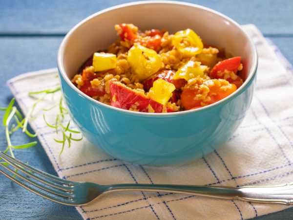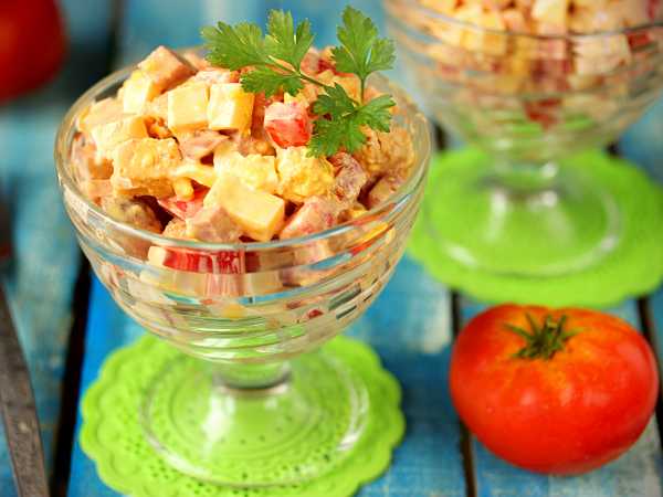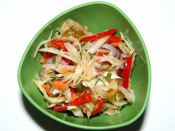 Вареные яйца очистим, из двух яиц извлечем желтки - они понадобятся для заправки. Оставшиеся три яйца мелко рубим ножом, к ним же можно добавить белки, оставшиеся от двух яиц (по желанию). Болгарский перец освобождаем от семян и режем на мелкие кубики.