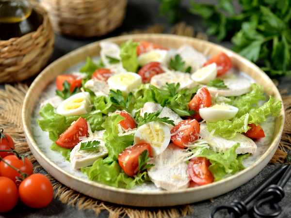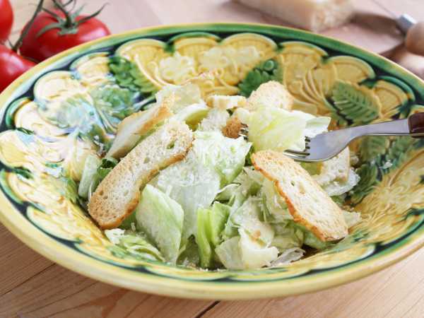 Еще раз взобьем заправку венчиком (или вилкой). Сверху щедро польем салат заправкой и подаем конвертики а-ля «Цезарь».