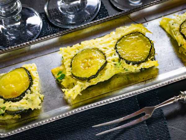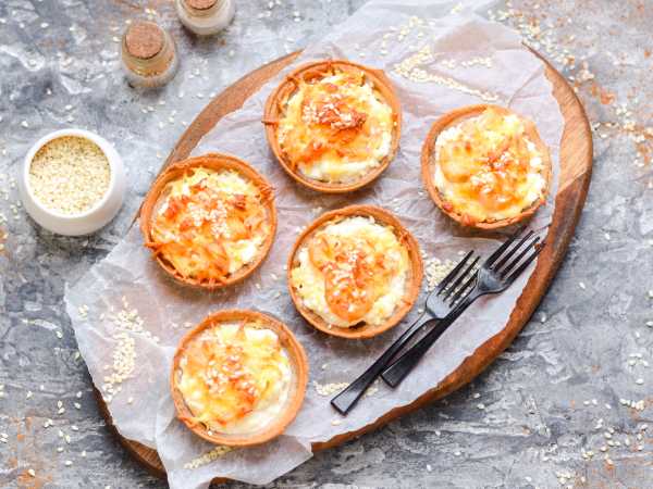Начините салатом тарталетки, украсьте по своему вкусу и подавайте в качестве холодной закуски под крепкие спиртные напитки.
