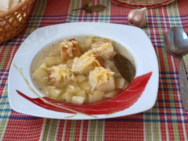 Разливаем чесночный суп-пюре по хлебным тарелкам и подаем к столу.