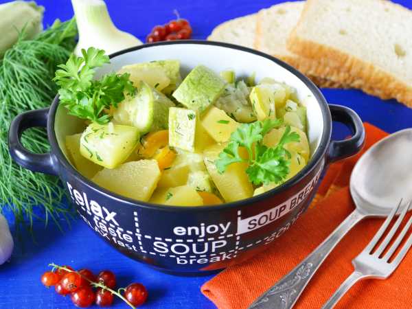 Тушеные кабачки с картошкой в сливках готовы. Подать блюдо порционно с салатом из свежих овощей или с домашними соленьями.