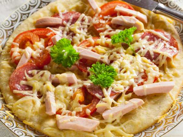 Пицца из очень мягкого сметанного теста с майонезом готовится на сковороде. Наше быстрое тесто подойдет и для пирога тоже. Получается эдакое универсальное скороспелое тесто для вкусной пиццы с колбасой и сыром, а также для заливного пирога с любой несладкой начинкой.