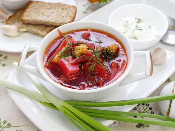 После этого разливаем борщ с курицей и фасолью по тарелкам, подаём с зеленью и сметаной.