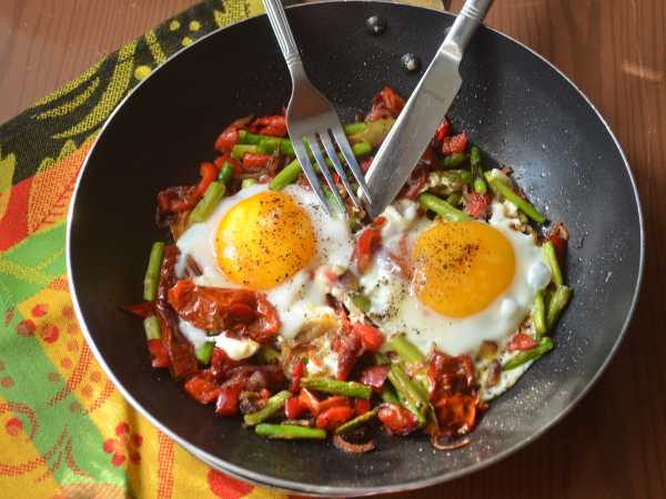 Для эффектной подачи, в качестве расслабленного завтрака выходного дня, такой вариант яичницы можно приготовить в духовке, в небольших, порционных формочках, ну а для быстрого перекуса – приготовить на сковороде. Процесс приготовления блюда займет не более 30 минут, а вкус порадует любого гурмана. Попробуйте!
