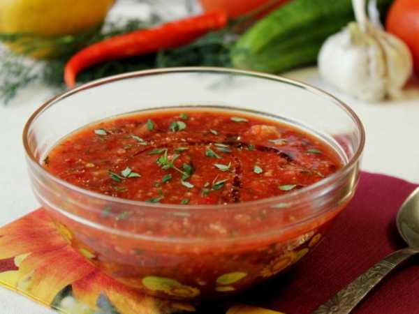 Помидоры в классическом рецепте следует бланшировать. Если не хотите возиться, тогда просто порежьте их слегка, чтобы блендеру было легче, с целыми ему не справиться.