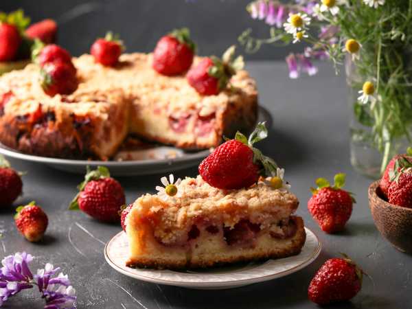 Вкусный, нежный клафути с клубникой готов. По желанию его можно посыпать сахарной пудрой или украсить остатками ягод, и в тёплом виде подавать на стол.
