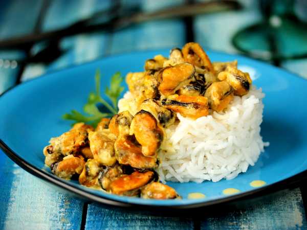 Мидий выложим в сковороду. И готовим мидий в соусе минут 10-12. Добавим соль по вкусу.