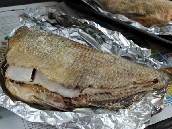Леща нужно почистить, выпотрошить, удалить жабры, если будете запекать с головой. Надрезы при таком способе готовки делать не обязательно, поскольку рыба довольно крупная и косточки в спинной части проще вынуть целыми. Посолим и поперчим леща со всех сторон, в том числе и внутри. Я отрезала хвост, чтобы удобнее было заворачивать леща в фольгу.