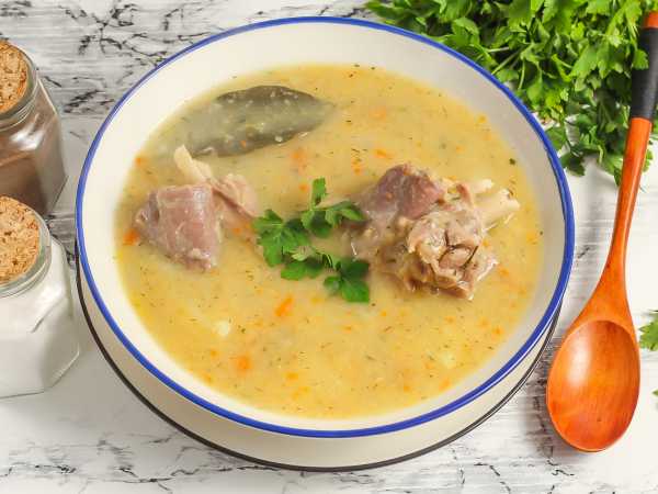 Очень вкусный классический гороховый суп без мяса готов. Разлейте его по порционным тарелкам и в горячем виде подавайте на стол.