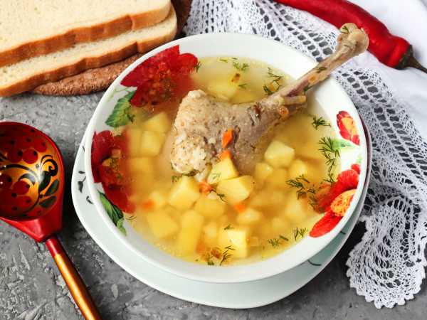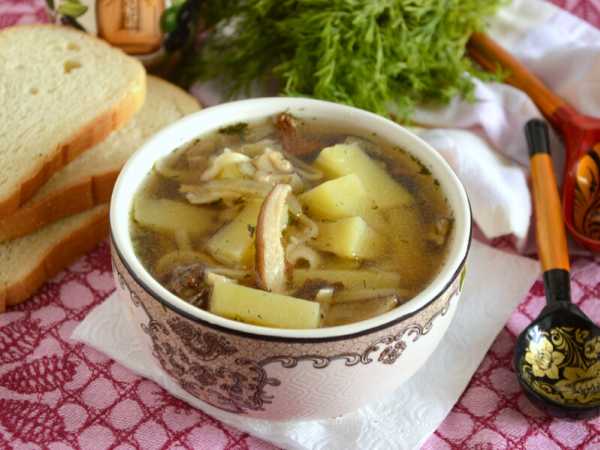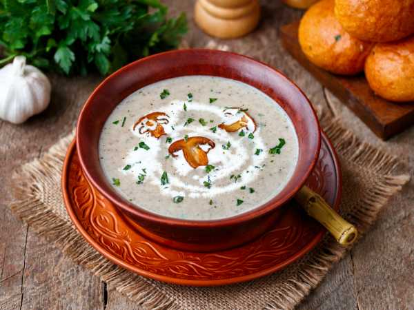 Суп-пюре из грибов и патиссонов готов! Подаем блюдо с сухарями, украсив его свежей зеленью. Приятного аппетита!