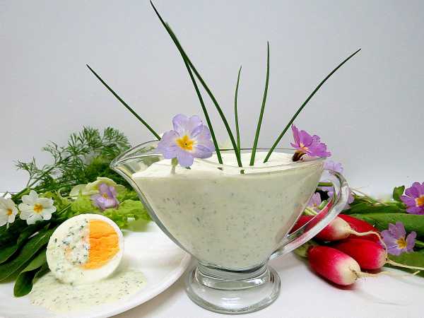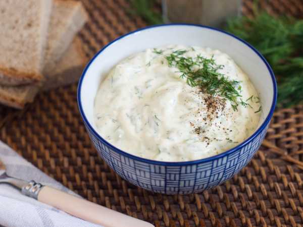 Добавляем чеснок и укроп к сметане и майонезу. Перемешиваем.