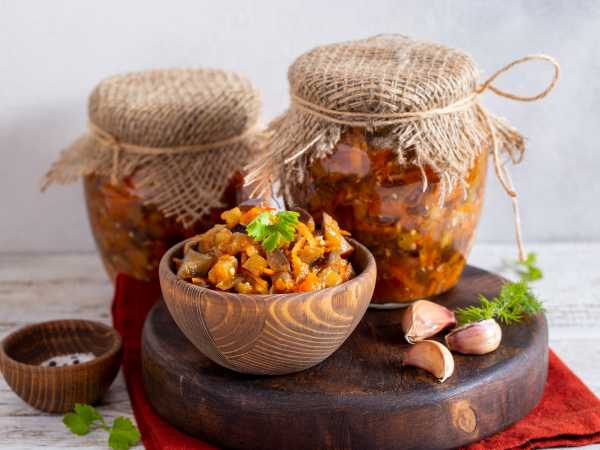 Выложите салат в горячие банки и сразу же закатайте горячими крышками по резьбе или под ключ. Дайте остыть при комнатной температуре. Салат Пятерочка с баклажанами на зиму готов.