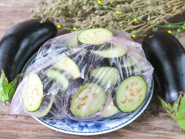 Промойте баклажаны и нарежьте крупными кусочками, отрезая хвостики. Добавьте в емкость и перемешайте, томите около 3-5 минут.