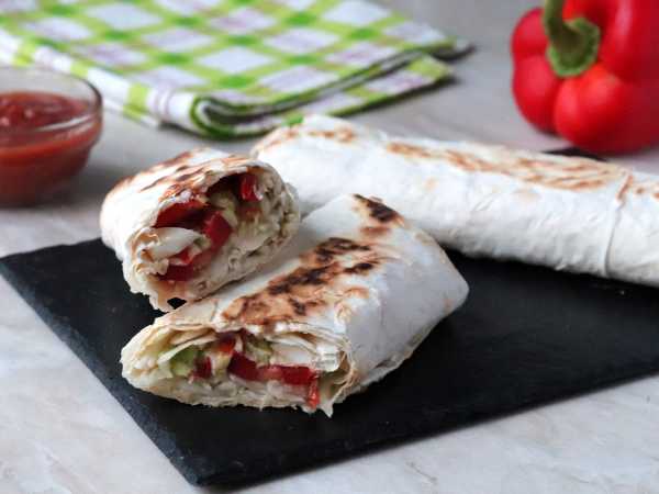 На круг лаваша выложить часть начинки, распределить ее по всей поверхности, оставив по 1 см с краю.