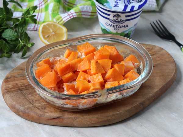 Прикройте кастрюлю крышкой и позвольте тыкве настояться при комнатной температуре минимум 3 часа, для того чтобы она пустила сок. Можно оставлять тыкву настаиваться на ночь.
